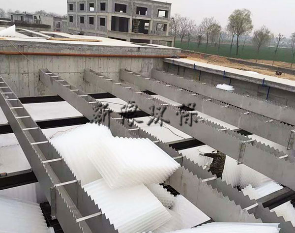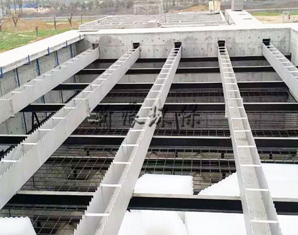 齒形集水槽(三角堰板式)兩側采用齒形堰板與槽體側板拼裝而成,拼裝孔為囊性具有可調性,堰齒角度為90度,